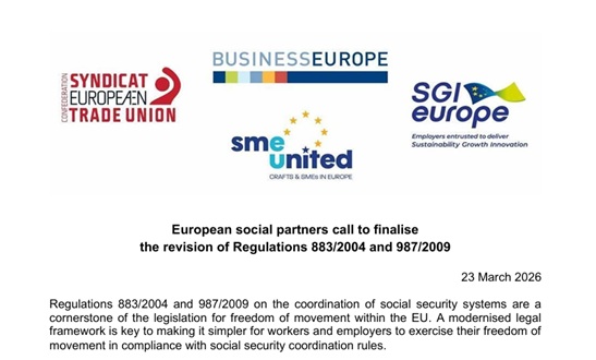 Ahead of the resuming of trilogue negotiations around the revision of the Regulations 883/2004 and 987/2009 on the coordination of social security systems across the EU, the cross-sectoral social partners (i.e. BUSINESSEUROPE, SME United, SGI Europe and ETUC) issued a Joint Statement, calling EU institutions to eventually close a deal on this cornerstone legislation for the free movement within the EU.