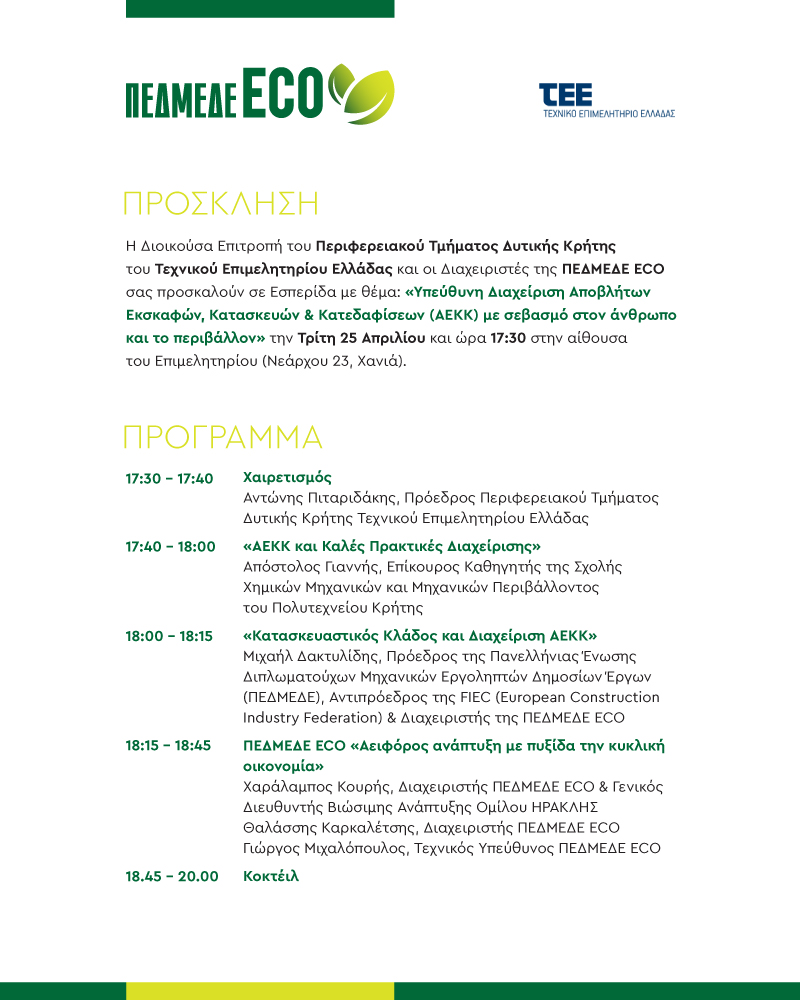 Η ΠΕΔΜΕΔΕ ECO σε συνεργασία με το ΤΕΕ Τμήμα Δυτικής Κρήτης, την Τρίτη 25/4 και ώρα 17:30 διοργανώνουν ενημερωτική εκδήλωση στο ΤΕΕ Δυτικής Κρήτης, με στόχο να γίνει ανταλλαγή απόψεων σχετικά με την τρέχουσα κατάσταση σε ευρωπαϊκό και πανελλαδικό επίπεδο, καθώς και για τις προβλεπόμενες διαδικασίες διαχείρισης ΑΕΚΚ βάσει της νομοθεσίας και τα πολλαπλά οφέλη που προκύπτουν για το περιβάλλον και τη δημόσια υγεία.